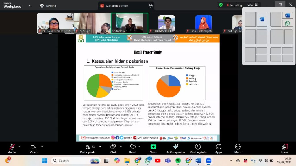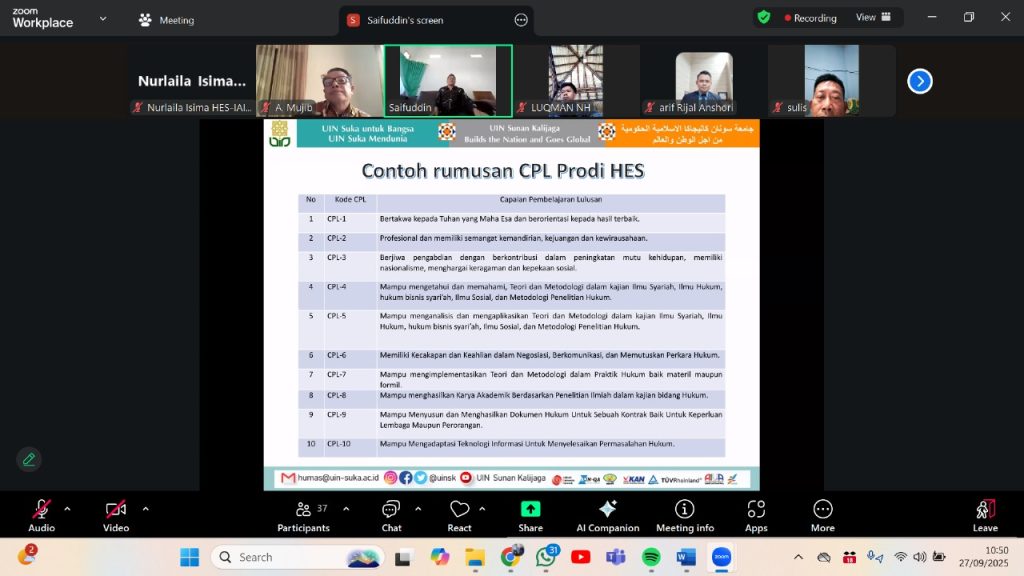 Manado – Kepala Program Studi Hukum Ekonomi Syariah (HES) IAIN Manado, Nurlaila Isima, S.H., M.H., mengikuti kegiatan Coaching Kurikulum Outcome Based Education (OBE) POSDHESI 2025 dengan fokus pada penyusunan kurikulum berbasis Profil Lulusan dan Capaian Pembelajaran Lulusan (CPL). Kegiatan ini berlangsung secara daring melalui aplikasi Zoom pada Sabtu, 27 September 2025, pukul 09.00–11.00 WIB.