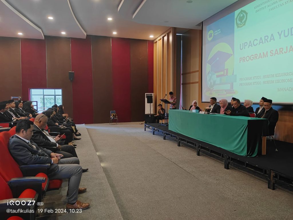 Senin, 19 Februari 2024. Master of ceremony dari kegiatan ini adalah Mohamad Rafiq Soleman, SH., adapun rangkaian acara dari kegiatan yudisium tersebut yaitu Pembukaan, pembacaan kalam ilahi oleh Akbar Azani Soleman., Menyanyikan lagu Indonesia Raya, Menyanyikan Lagu Mars IAIN Manado, Pembacaan SK Yudisium Hukum Ekonomi Syariah oleh Nurlailah Isima, MH., Pembacaan naskah Yudisium sekaligus sambutan oleh Dekan Fakultas Syariah Prof. Dr. Rosdalina Bukido M.Hum., pesan-pesan oleh Prof. Dr. Nasruddim Yusuf, M.Ag., penyematan salempang, do’a penutup yang dibawakan oleh Mohammad Fitri Adam, S.HI.